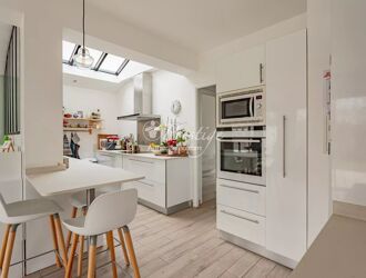 Vaste séjour et salle à manger ouvrant sur balcon filant SUD. Cuisine contemporaine, aménagée et équipée , électroménager Siemens.